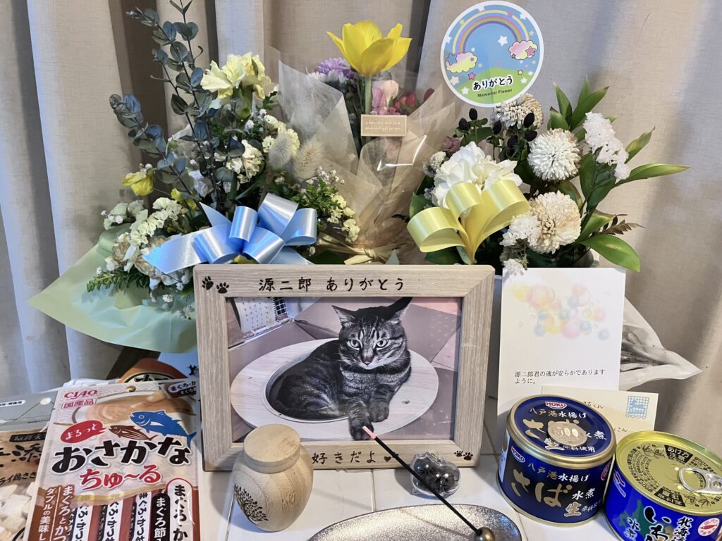 約一か月前、我が家の愛猫源二郎が6歳という若さで突然死で亡くなりました。沢山の方にお花をいただき亡くなって1カ月近くたってもまた新たにお花をいただき、源二郎が残してくれた功績の大きさに「源二郎が与えてくれたものはすごいね。お母さんも源二郎も幸せだね。」と心から感謝しています。